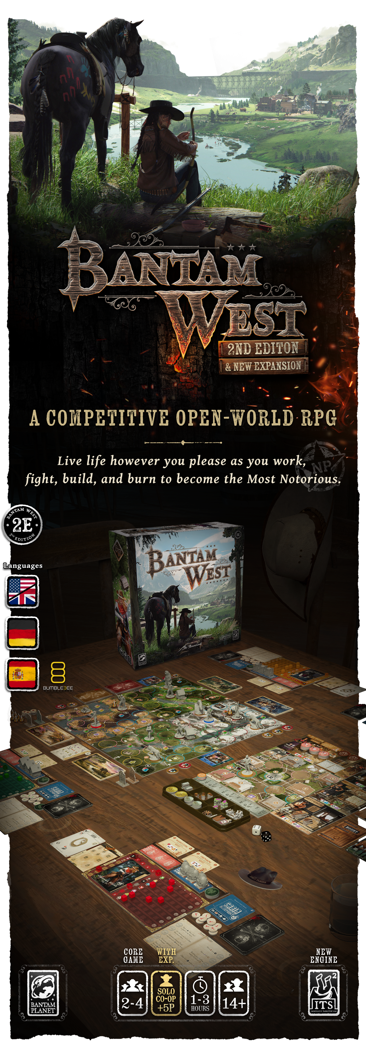 Descripción: Bantam West (2ª Edición) es un juego de rol competitivo de mundo abierto donde trabajas, luchas, construyes, comercias y arrasas tu camino a través de Lone Range para convertirte en el Más Infame. Con una NUEVA expansión para quinto jugador/solo/cooperativo, juega de 1 a 5 jugadores y adéntrate en un mundo inexplorado bajo el mapa. Busca reliquias y riquezas, pero ten cuidado con los cultistas y las horribles criaturas que acechan en las profundidades. En un mundo donde el oro es solo un mito, ¿serás el primero en encontrarlo y demostrarles a todos que estaban equivocados?