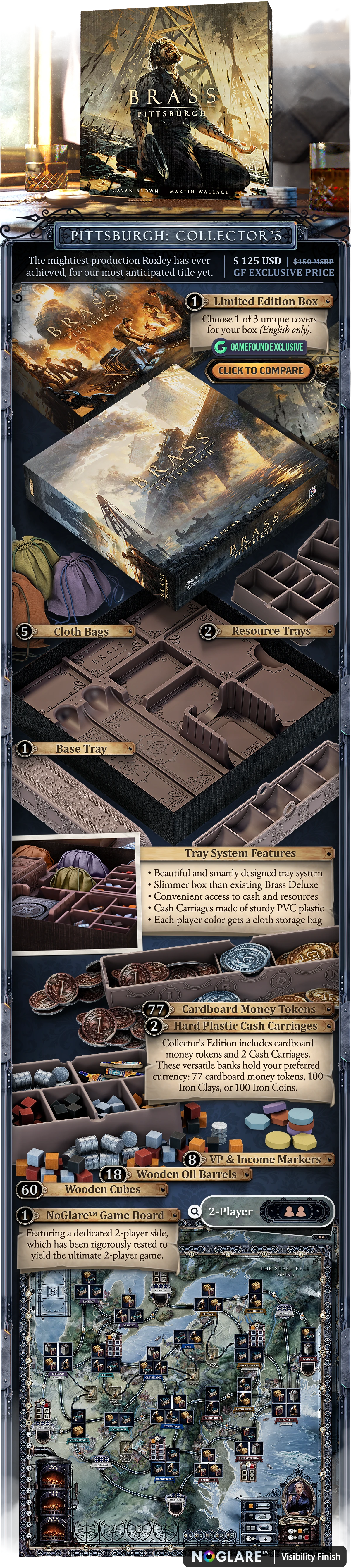 Descripción: De Roxley Games y el co-diseñador de Brass: Birmingham, Gavan Brown, llega Brass: Pittsburgh - capturando el explosivo boom industrial de la Edad Dorada de América a finales del siglo XIX en el Cinturón del Acero ubicado en el noreste de Estados Unidos. Los jugadores asumen el papel de un titán industrial despiadado en la era de Cornelius Vanderbilt, Andrew Carnegie, John D. Rockefeller y Henry Frick mientras construyen extensas redes de ferrocarriles, oleoductos, acerías, refinerías de petróleo y más.