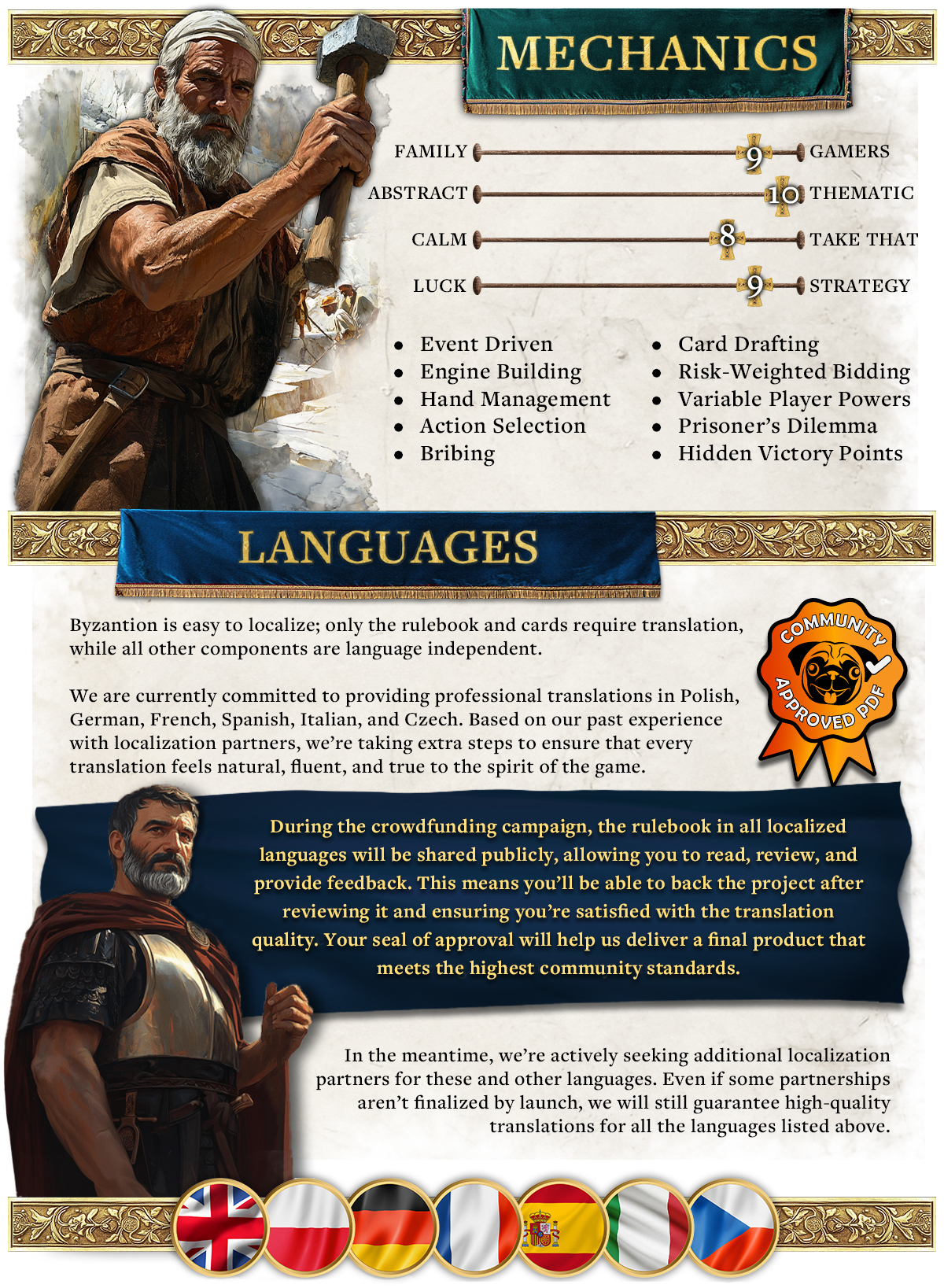 Descripción: Byzantion es un juego de mesa competitivo y basado en eventos en el que los jugadores lideran poderosas facciones para decidir el destino del Imperio bizantino mediante intrigas políticas, una planificación cuidadosa y la creación dinámica de motores.