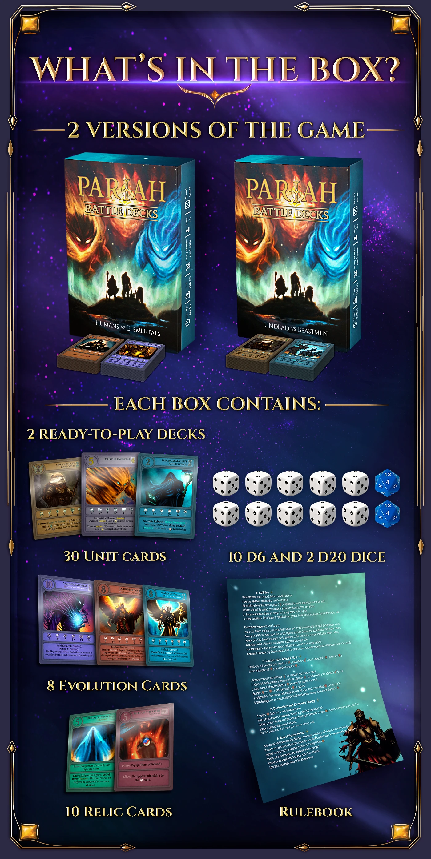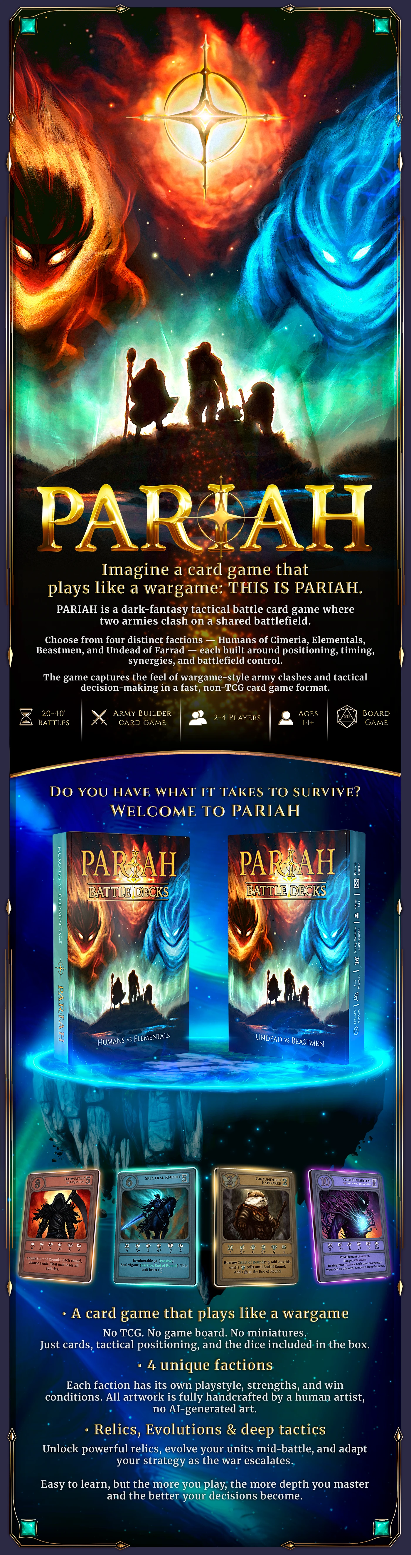 Descripción: Un juego de cartas que se juega como un juego de guerra. ¿Tienes lo que se necesita para sobrevivir? Bienvenido a PARIAH.