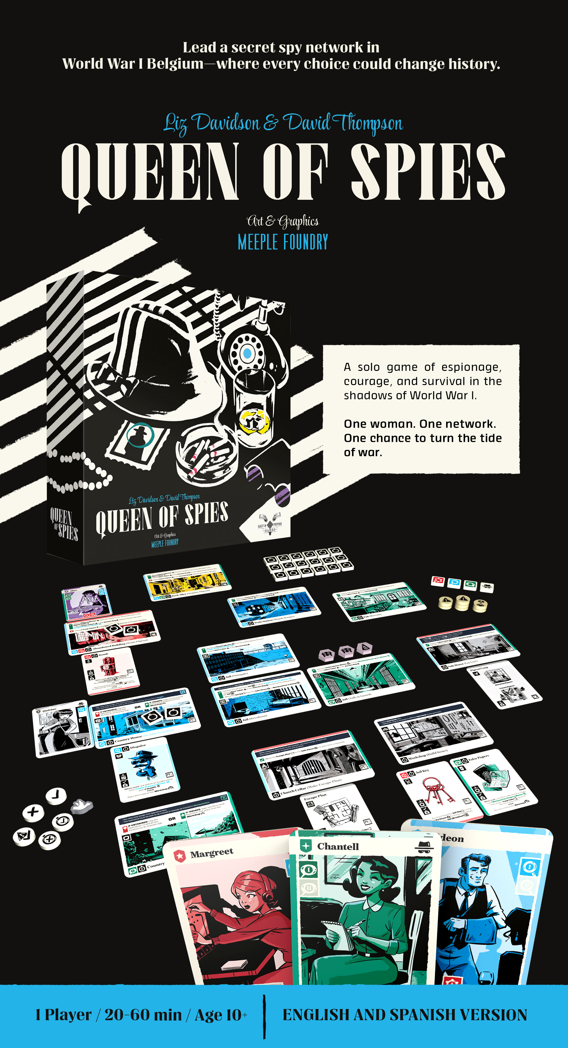 Descripción: Queen of Spies es un juego de mesa en solitario, narrativo, de espionaje y misiones audaces ambientado en la Bélgica ocupada durante la Primera Guerra Mundial.