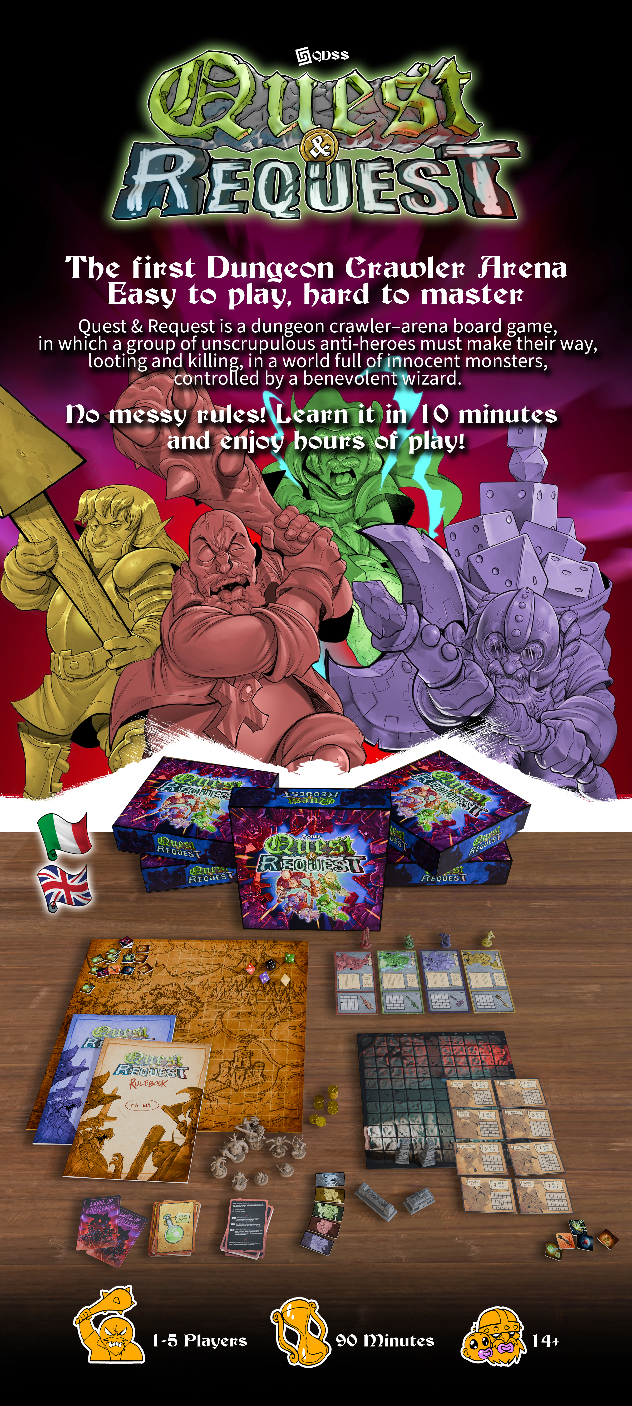 Descripción: Quest & Request es un juego de mazmorras estratégico de arena para hasta 5 jugadores, ambientado en un mundo de fantasía retorcido e irónico. Cuatro jugadores asumen el papel de despiadados (anti)héroes, mientras que un quinto se convierte en Ciarman, el mago bondadoso que controla trampas, monstruos y la propia arena. Cada partida alterna entre fases de exploración del mapa y combate táctico dentro de una arena personalizada, combinando mecánicas fáciles de aprender con una gran rejugabilidad.