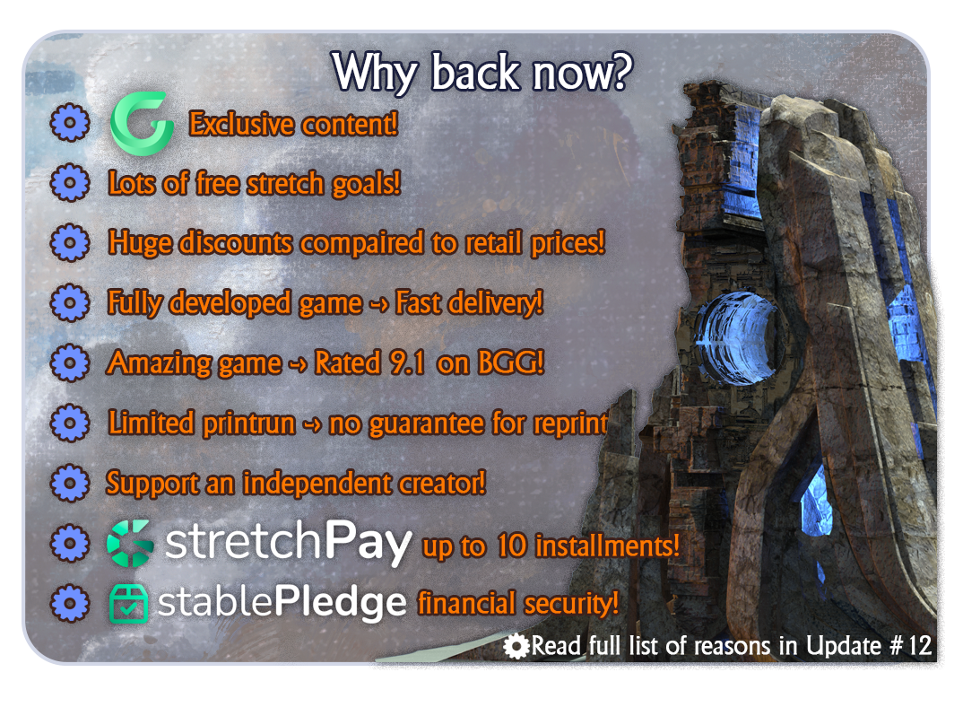 Tipo de juego / Etiquetas: fantasía, exploración, Ciencia ficción, estrategia, supervivencia, guerra, dados, control de área, aventura, componentes del juego, multijugador, 4X, asimétrico, civilización, gestión de recursos, colocación de trabajadores, político, económico