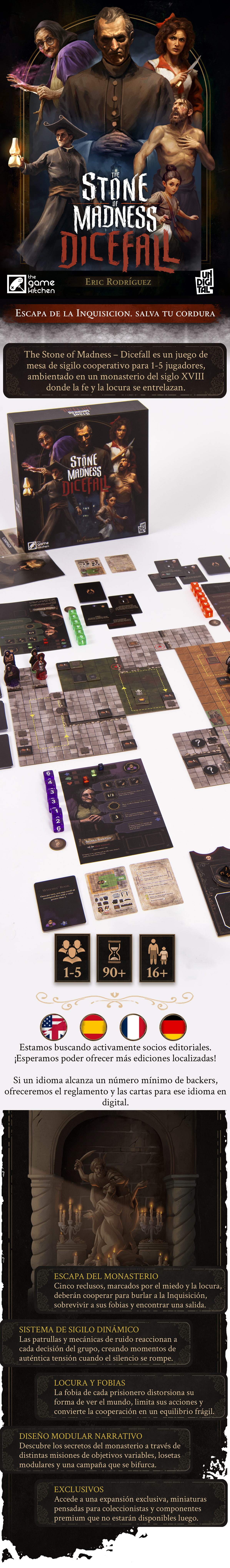 Descripción: Adéntrate en el monasterio como nunca antes lo habías hecho. Asume el papel de uno de los cinco prisioneros, cada uno de ellos atormentado por el miedo y la locura, y colaborad para burlar a la Inquisición, sobrevivir a vuestras propias fobias y descubrir los oscuros secretos que se esconden tras sus muros. Inspirado en el aclamado videojuego, The Stone of Madness – Dicefall lleva la tensión, el suspense y el desafío psicológico directamente a tu mesa.
