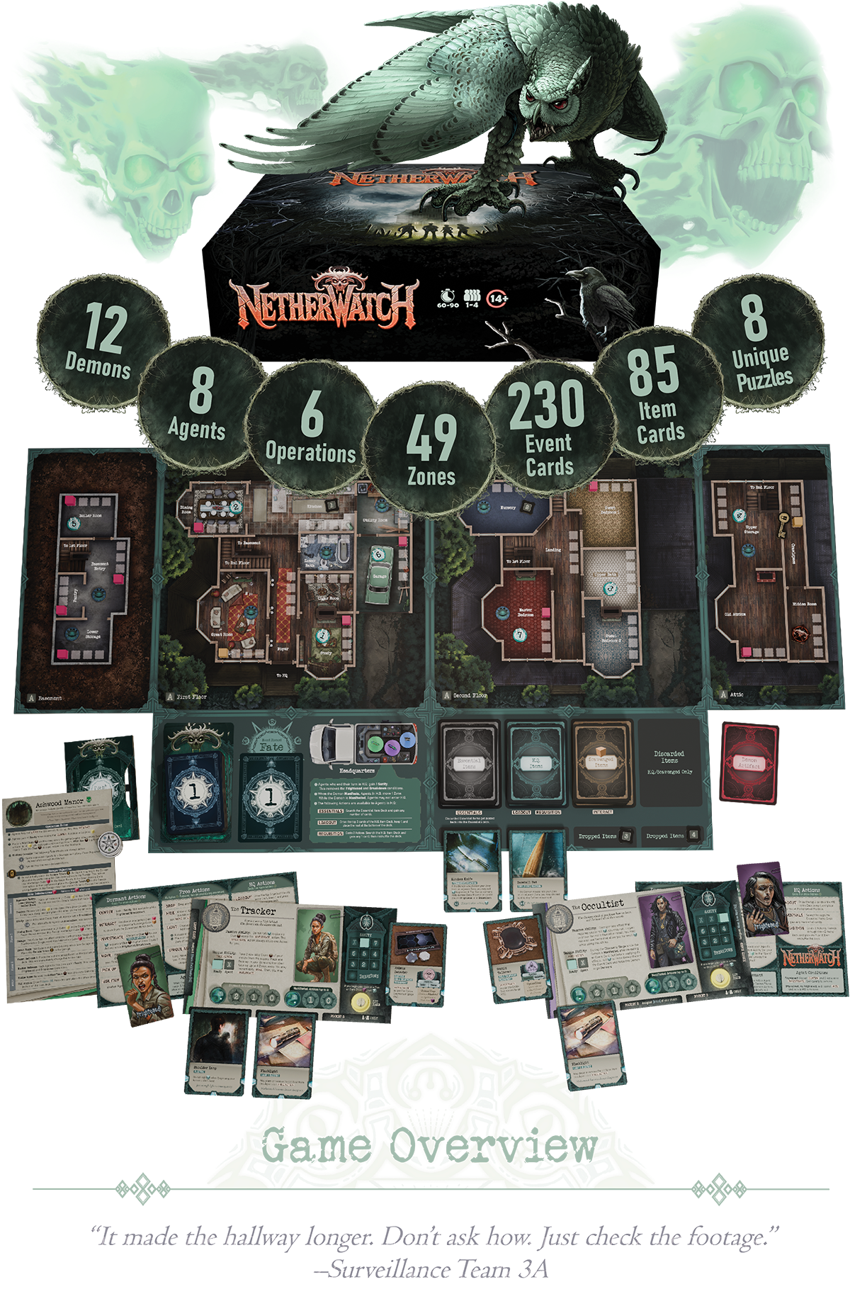Cada misión se desarrolla en dos fases: primero, los jugadores deben investigar y deducir la identidad del demonio mientras gestionan su cordura y evitan manifestaciones mortales; luego, deberán realizar un ritual de exorcismo de alto riesgo o escapar antes de que el Demonio los alcance. Con habilidades únicas de agentes, adversarios impredecibles y una tensión creciente, Netherwatch combina deducción estratégica, terror de supervivencia y cooperación intensa en una experiencia de juego inmersiva.