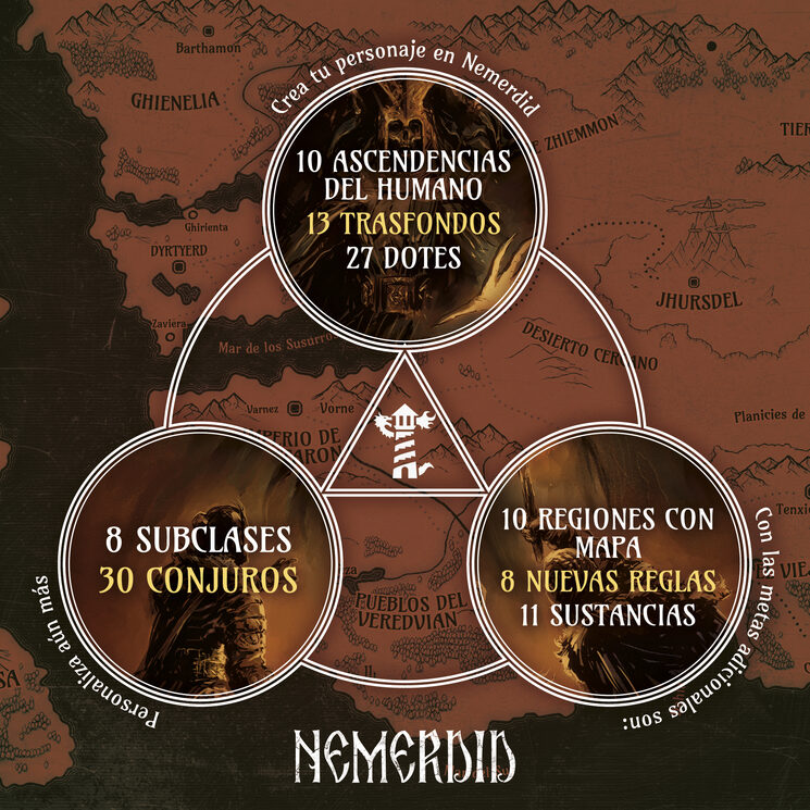 Descripción: Nemerdid es un escenario de campaña de fantasía oscura para Dungeons and Dragons. En este inmisericorde continente, formado por 10 vastos territorios, el horror y la fantasía se unen para contar historias donde ya no existen los héroes, solo el mundo imponiendo su voluntad sobre aquellos que intentan salir adelante.