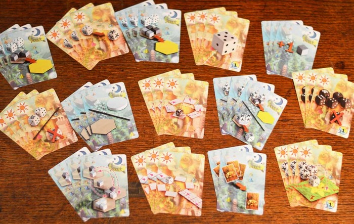 - Día: se tiran los dados y se colocan en las cartas de acción respetando la distribución de dados por tiradas, el orden de turno y las reglas de colocación.