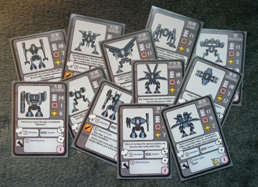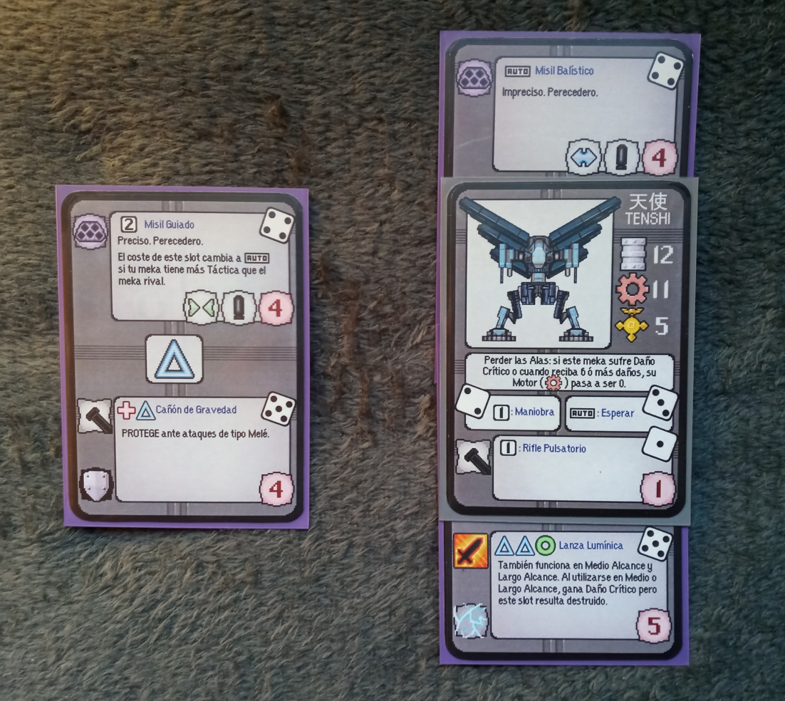 Es un juego de cartas en el que cada Mecha se "monta" añadiendo a una carta de "chasis" dos cartas de "armas", creando así una estructura de 3 cartas por mecha. Tal que así: