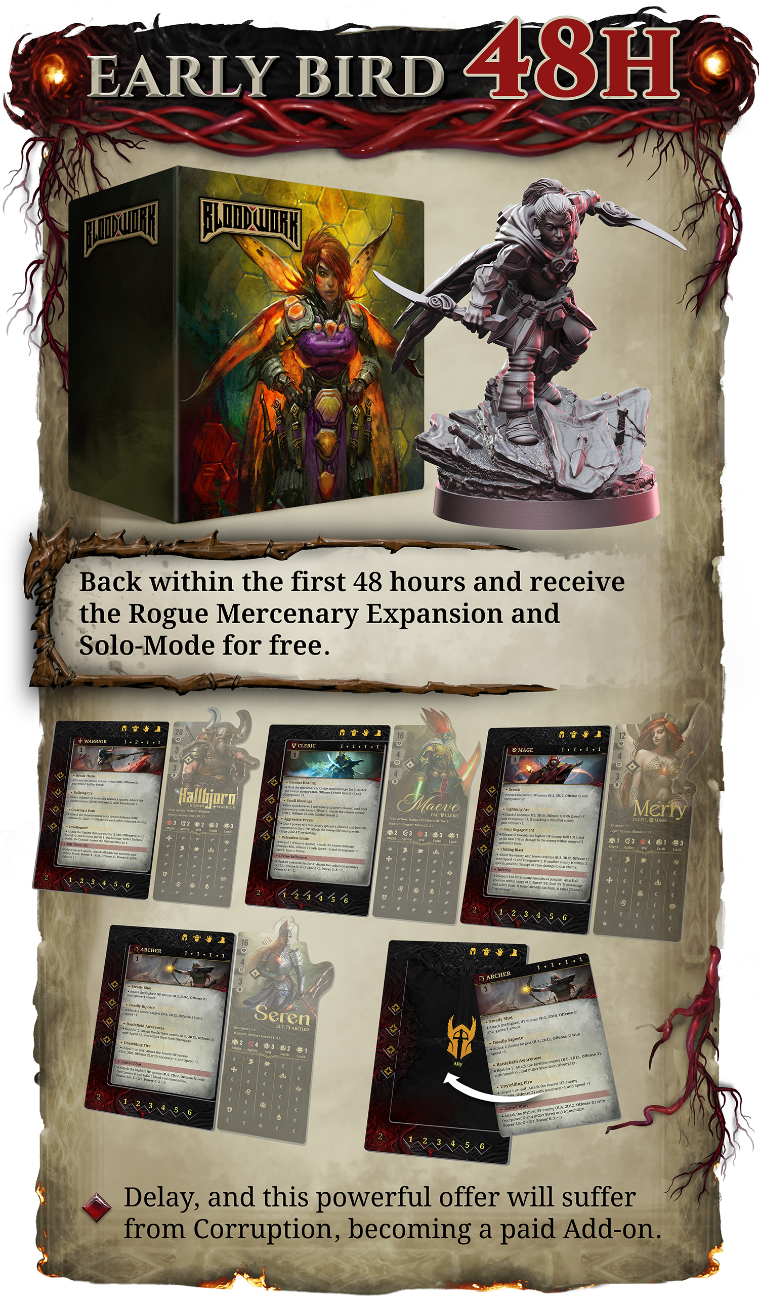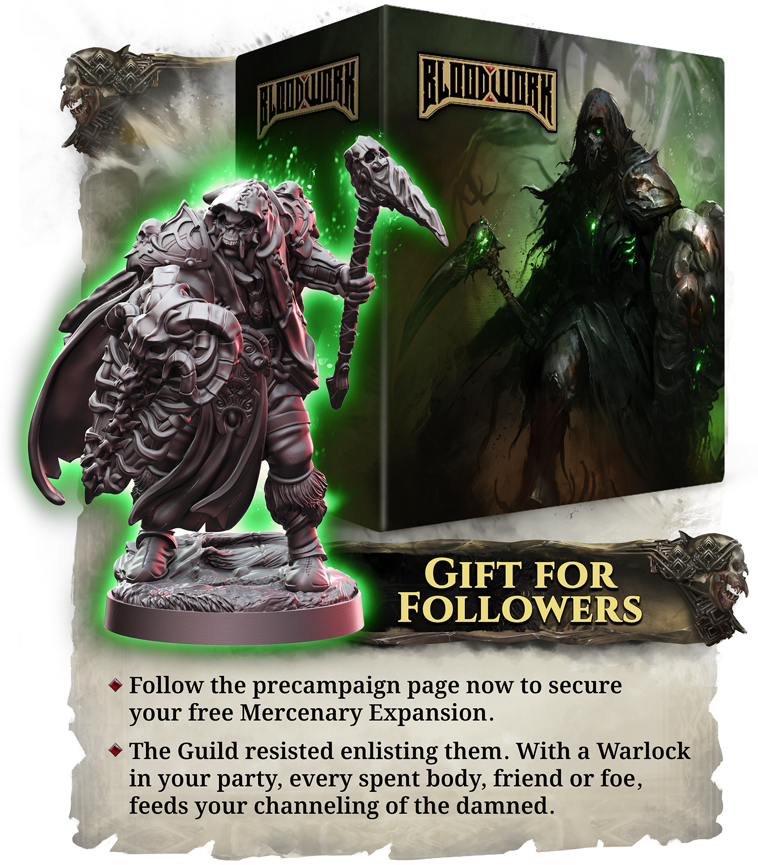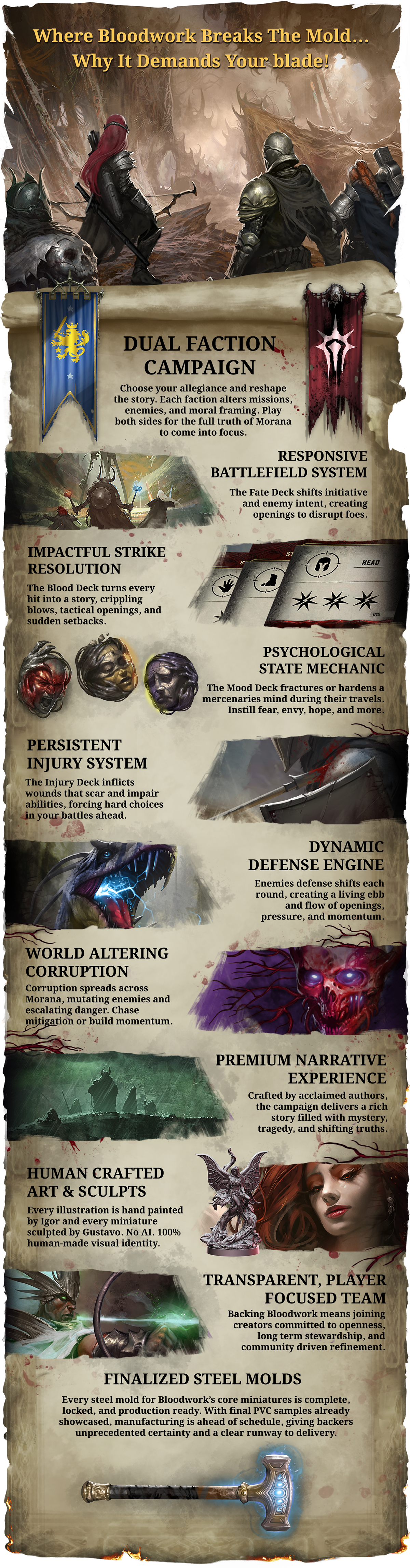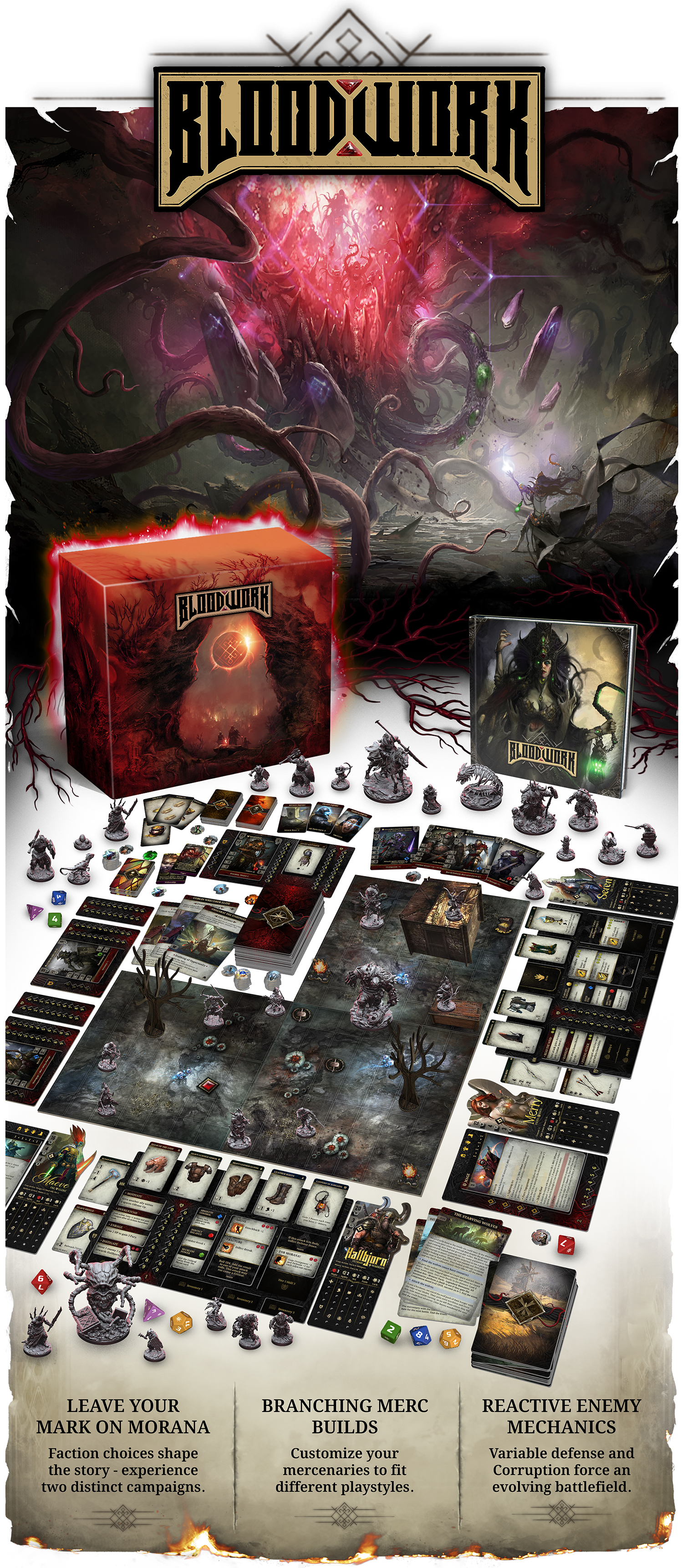 Bloodwork es un juego de mesa cooperativo de fantasía oscura para 1 a 4 jugadores, ambientado en un mundo destrozado por la muerte de su Diosa y la corrupción cósmica desatada a su paso. Dirige un grupo de mercenarios del gremio a través de una campaña ramificada de dos facciones, eligiendo ponerte del lado de los Caballeros Xalgaren o las Tribus Orcas a medida que tus decisiones remodelan las misiones que te esperan. Sobrevive a viajes peligrosos llenos de emboscadas, reliquias, peligros y oportunidades fugaces. Enfréntate a tensas batallas basadas en cuadrículas donde el posicionamiento, las habilidades asimétricas y las opciones de riesgo-recompensa definen cada pelea.