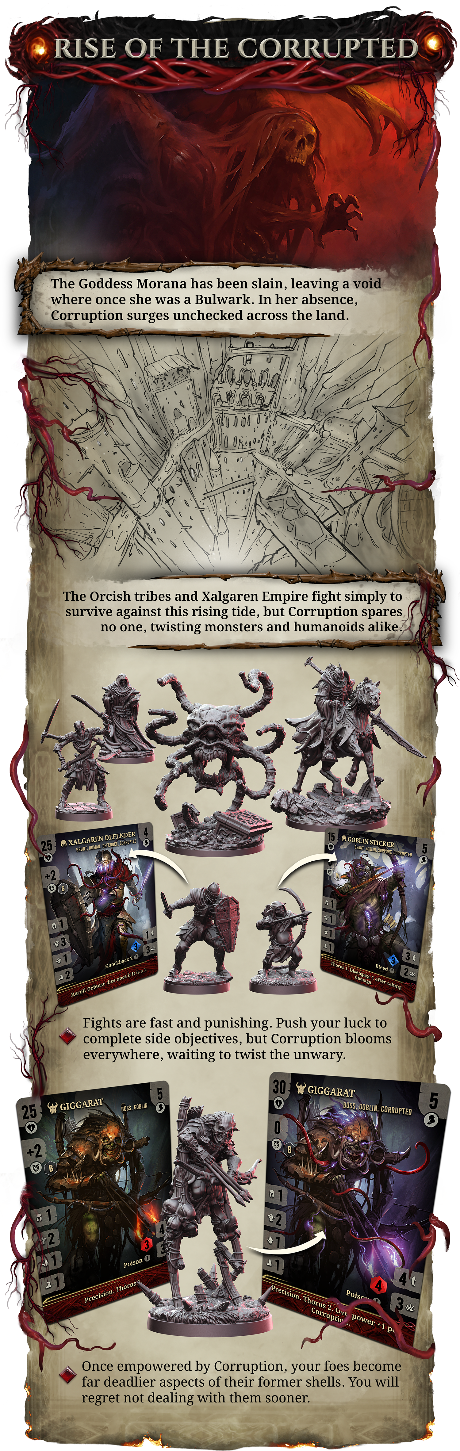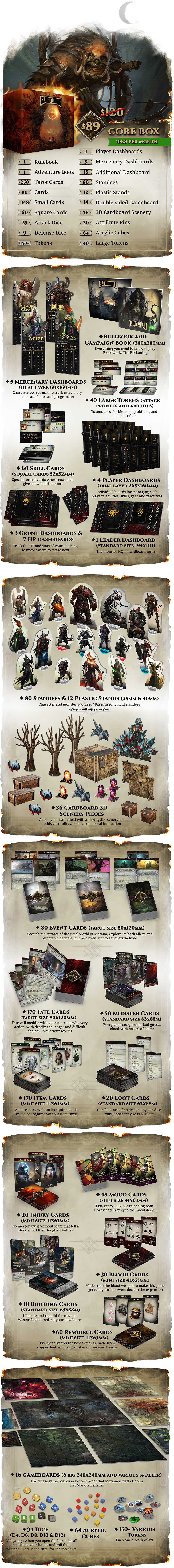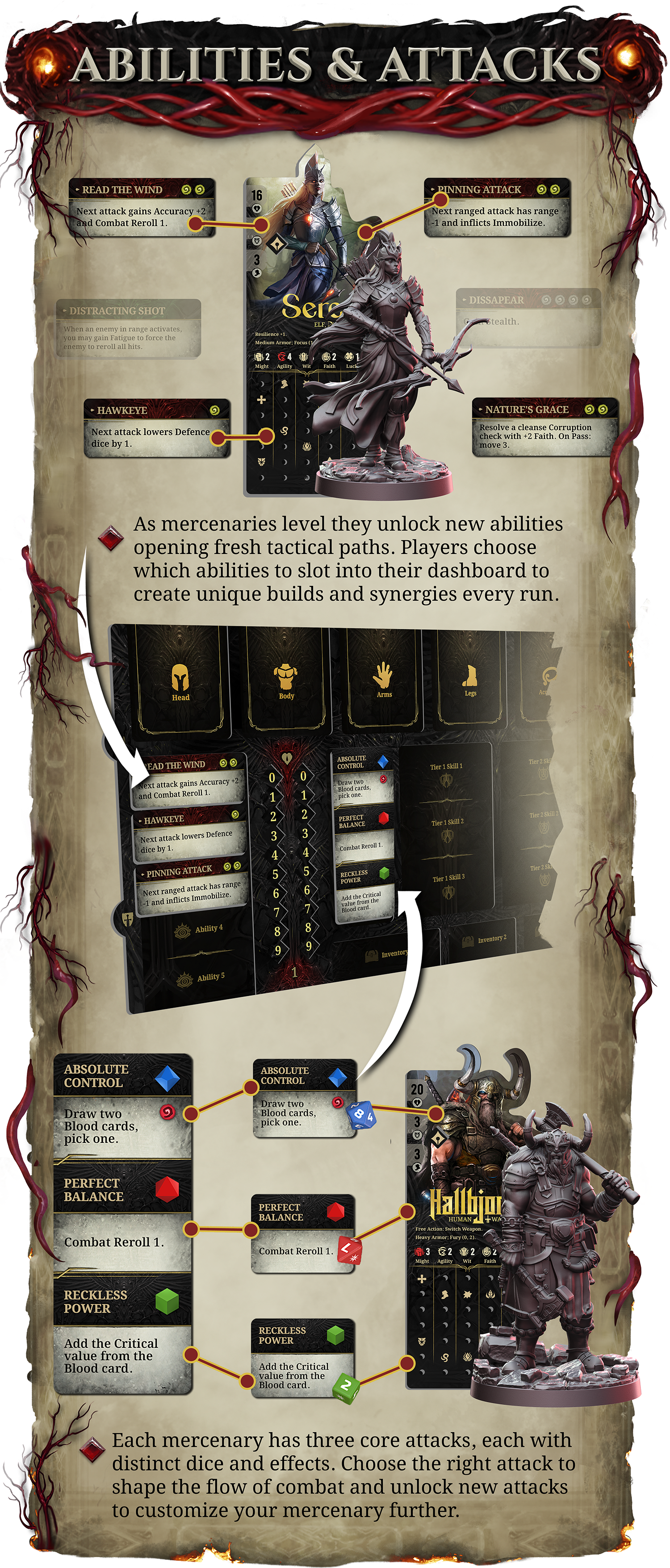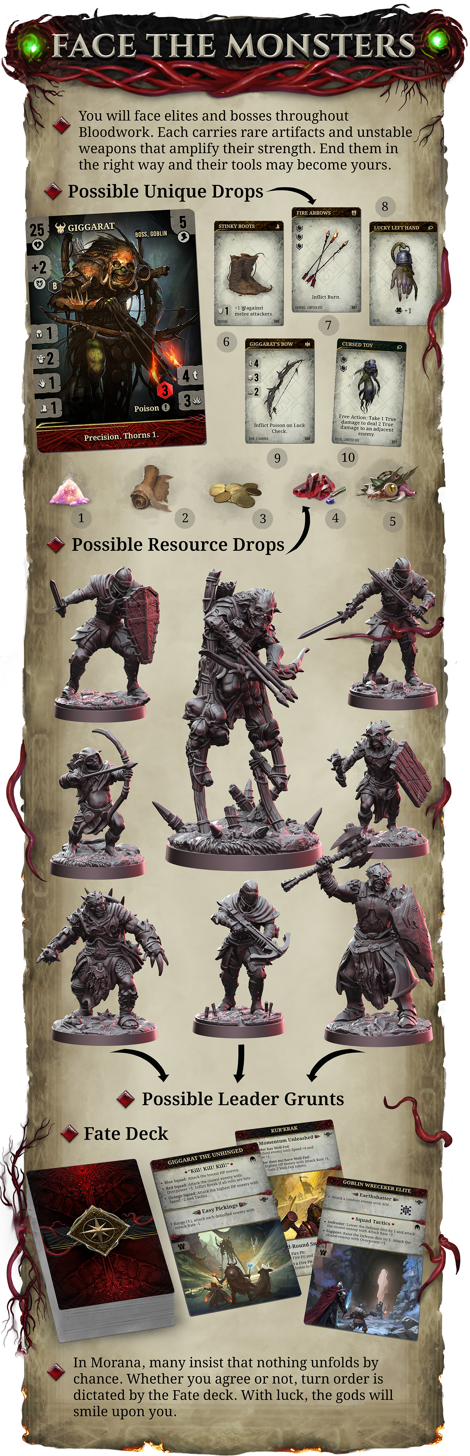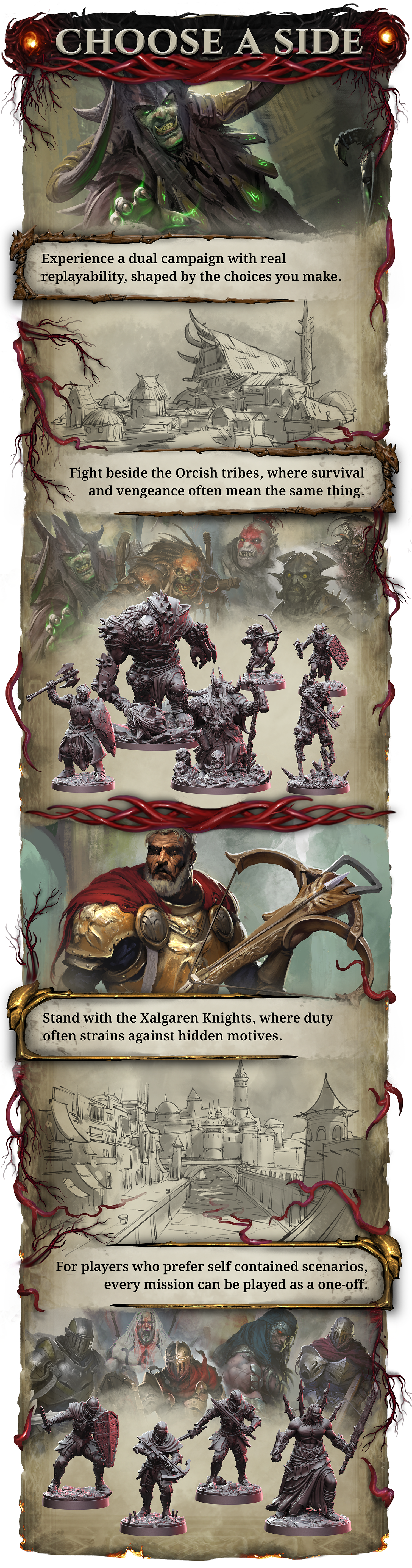 Bloodwork es un juego de mesa cooperativo de fantasía oscura para 1 a 4 jugadores, ambientado en un mundo destrozado por la muerte de su Diosa y la corrupción cósmica desatada a su paso. Dirige un grupo de mercenarios del gremio a través de una campaña ramificada de dos facciones, eligiendo ponerte del lado de los Caballeros Xalgaren o las Tribus Orcas a medida que tus decisiones remodelan las misiones que te esperan. Sobrevive a viajes peligrosos llenos de emboscadas, reliquias, peligros y oportunidades fugaces. Enfréntate a tensas batallas basadas en cuadrículas donde el posicionamiento, las habilidades asimétricas y las opciones de riesgo-recompensa definen cada pelea.