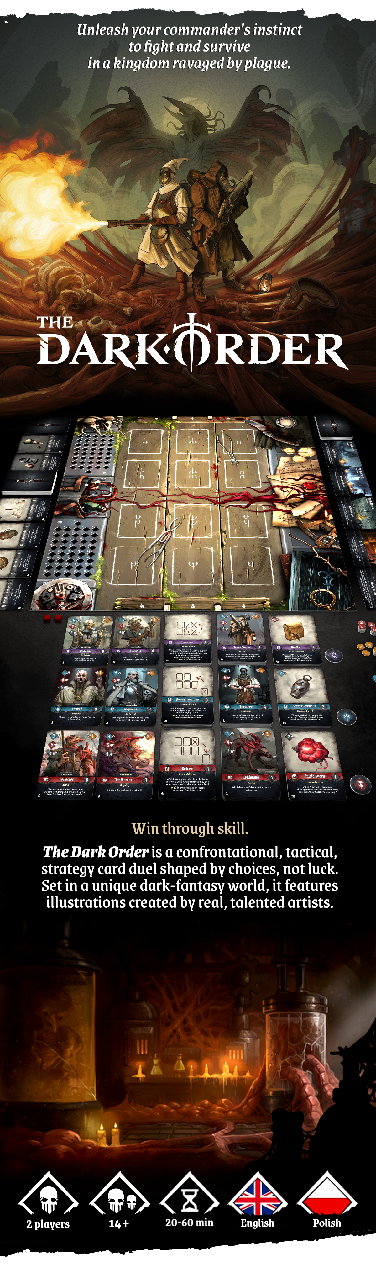 Gana gracias a tu habilidad y da rienda suelta a tu instinto de mando para luchar y sobrevivir en un reino devastado por la peste. The Dark Order es un juego de cartas de duelo táctico y estratégico basado en decisiones, no en la suerte.