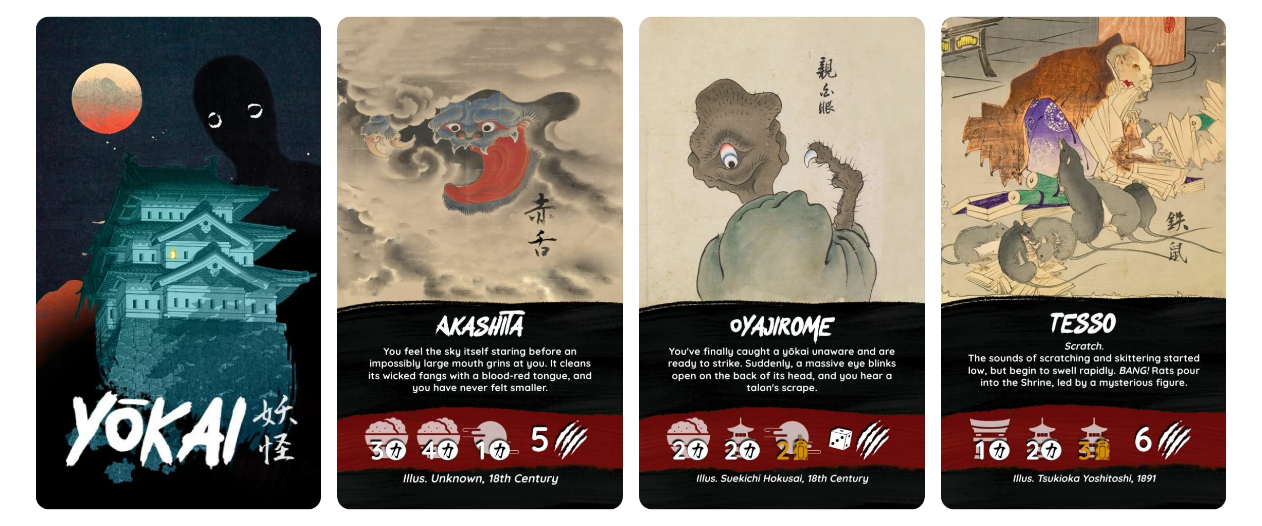 Las Almas Perdidas, el Mononoke y los Yōkai cobran vida en los componentes del juego gracias a grabados prácticamente inalterados del arte de los siglos XVIII y XIX.