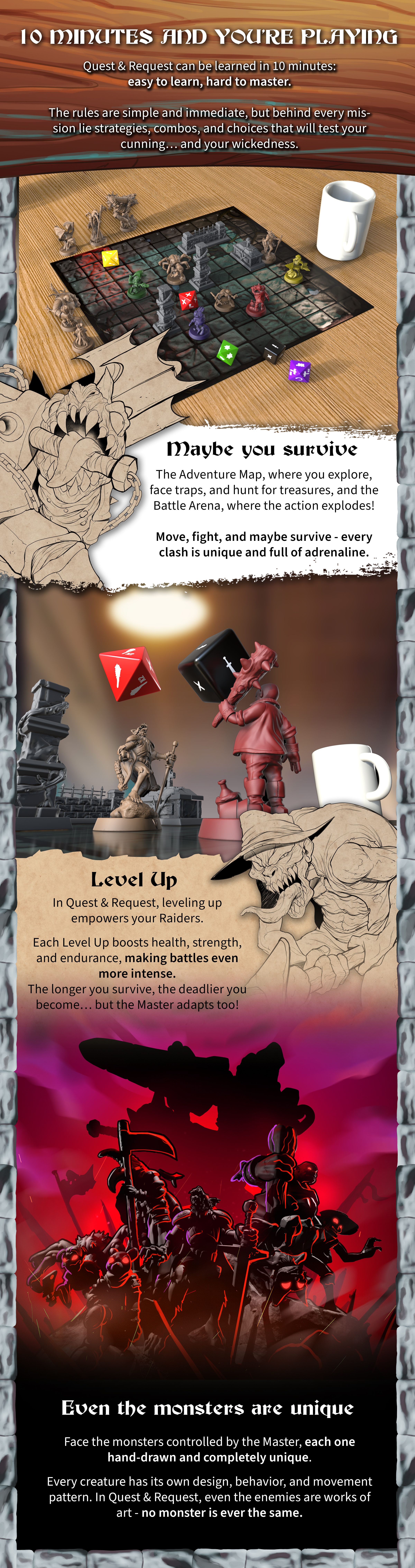Quest & Request es un juego de mazmorras estratégico de arena para hasta 5 jugadores, ambientado en un mundo de fantasía retorcido e irónico. Cuatro jugadores asumen el papel de despiadados (anti)héroes, mientras que un quinto se convierte en Ciarman, el mago bondadoso que controla trampas, monstruos y la propia arena. Cada partida alterna entre fases de exploración del mapa y combate táctico dentro de una arena personalizada, combinando mecánicas fáciles de aprender con una gran rejugabilidad.