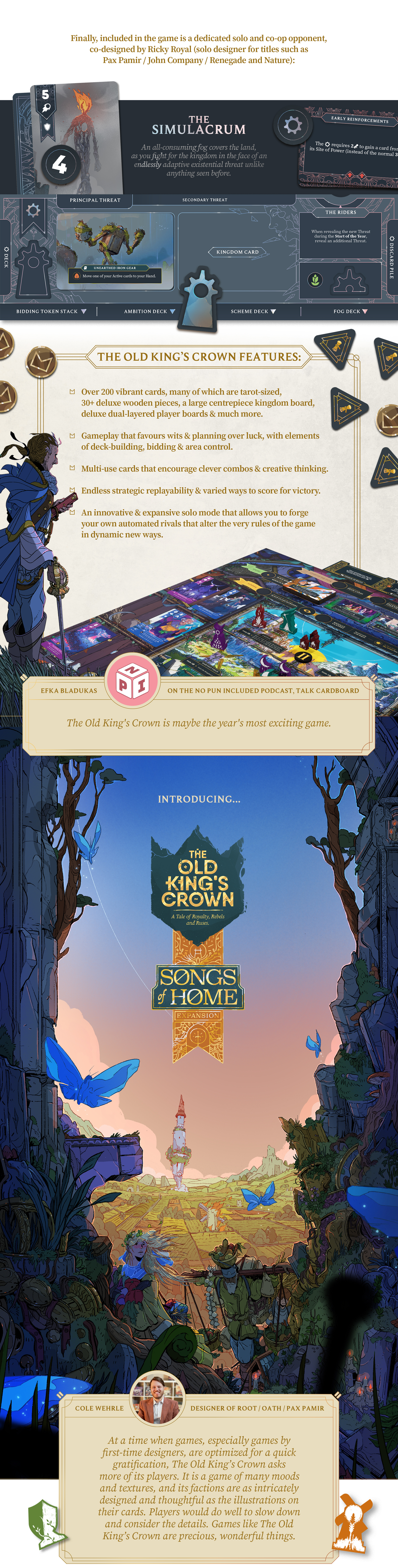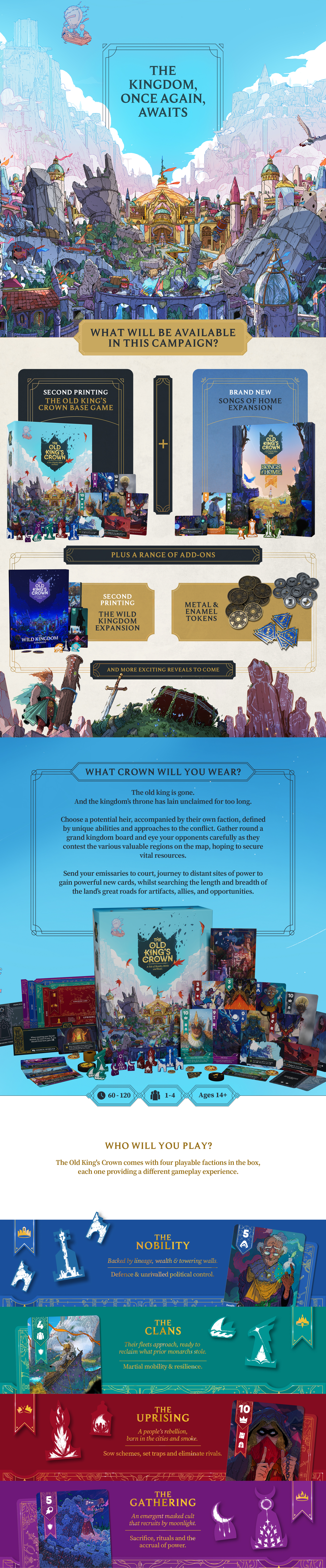 The Old King's Crown es un juego de mesa estratégico a gran escala para 1-4 jugadores, basado en la habilidad y la intriga, ambientado en un antiguo reino en ruinas, donde cada carta es una ventana a una tierra fantástica. Enfréntate a las fuerzas de tus oponentes en el mapa, compite por el control de los consejos políticos y viaja a lugares salvajes de poder. El reino te da la bienvenida una vez más con una segunda edición de The Old King's Crown, así como con una nueva y amplia expansión que introduce nuevas facciones, cartas de reino neutrales y emocionantes formas de ayudarte a reclamar el trono.