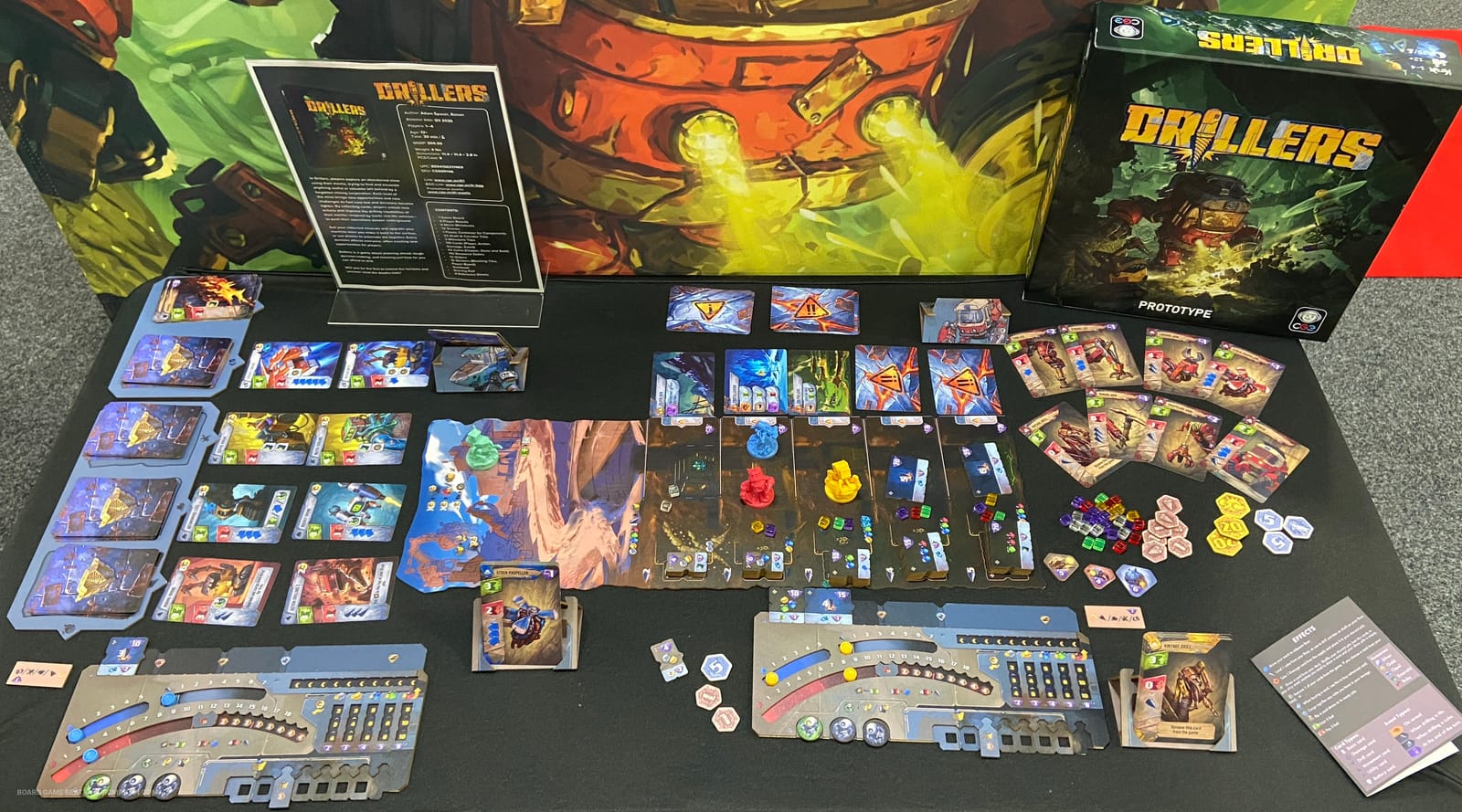 Drillers es un juego de construcción de mazos en el que la mayoría de las cartas te permiten mover tu taladro o perforar con él, usando tu taladro para excavar en las profundidades de la tierra.