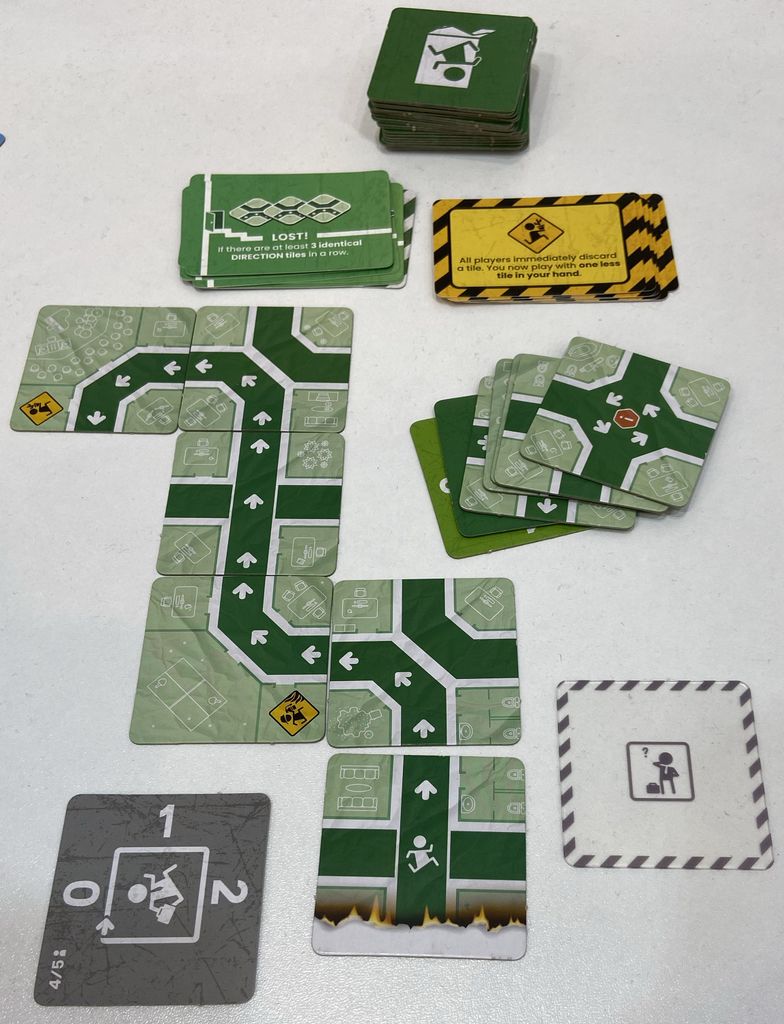 Los jugadores se turnan para colocar una ficha en una pila compartida, y las flechas de esas fichas determinan hacia dónde se dirige todo el grupo. Intentas seguir mentalmente ese camino y, si crees que el grupo se ha perdido, tal vez porque has dado vueltas sobre ti mismo, puedes jugar una ficha de «perdido» para salir de esa ronda. Si has escapado en el momento adecuado, genial, pero si has abandonado el barco cuando deberías haber seguido corriendo, serás castigado.